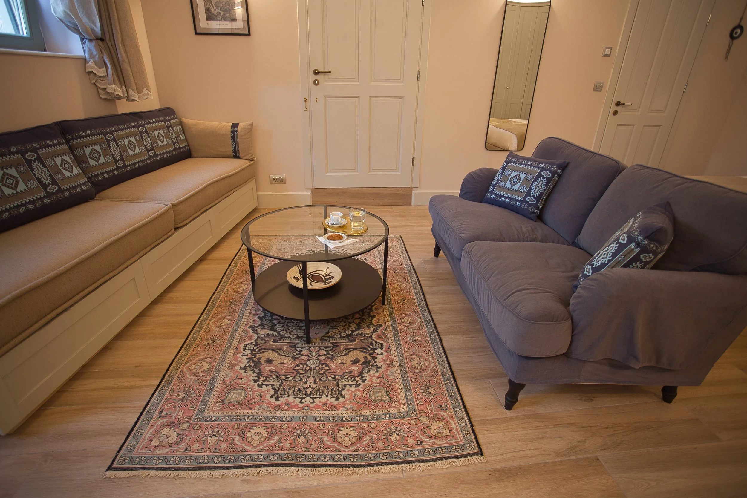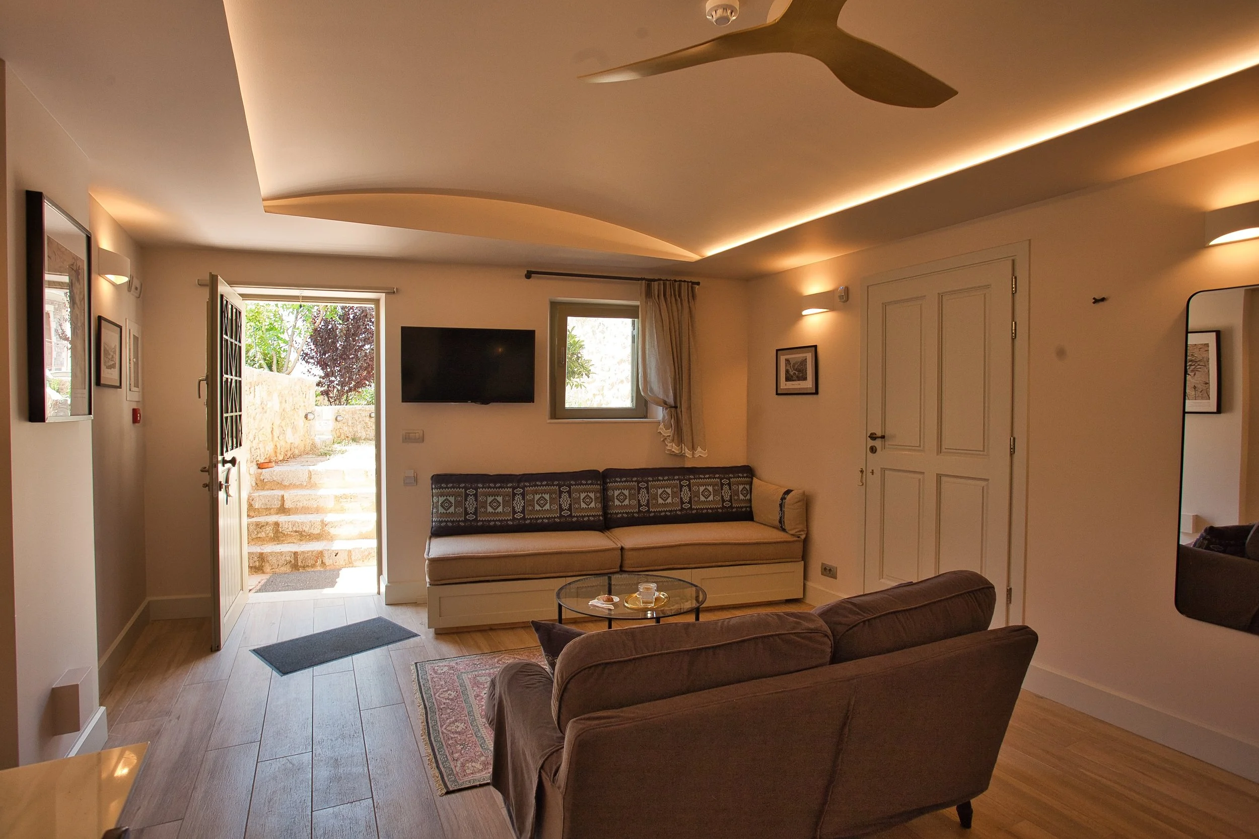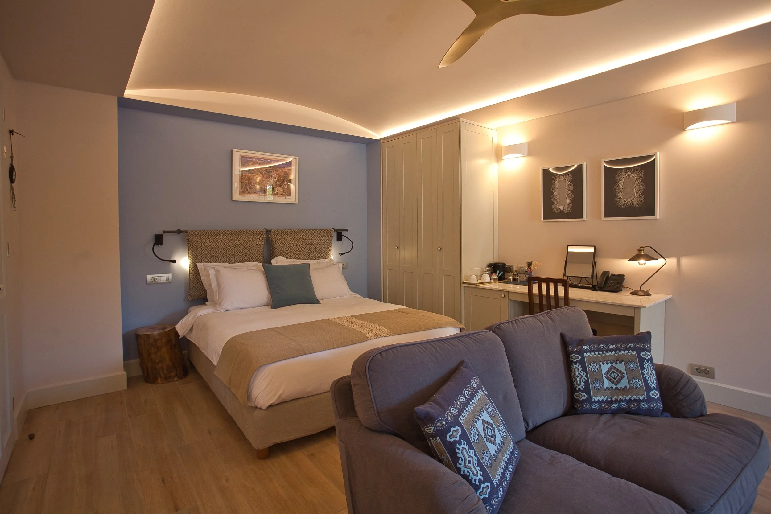 Welcome to Tholos, accessed from the garden level of the stone Tower. The spacious and atmospheric room features a gentle curved ceiling with hidden lighting, together with a cosy sitting in-built ‘divani’, furnished with traditional Greek design motifs and fabrics. The colour scheme of blue and purple borrows from the wild flower Delphinium of Ajax that we found growing outside the room where you can enjoy your morning coffee.